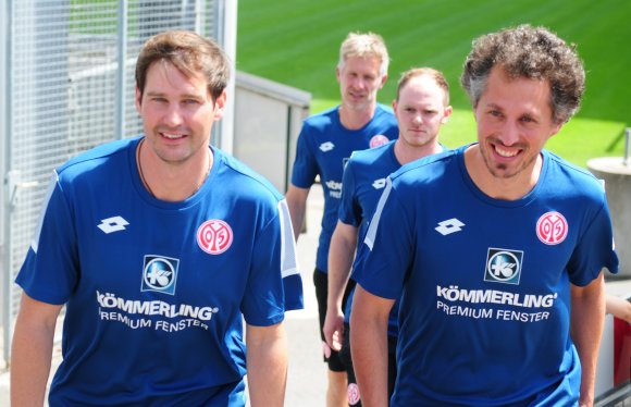 Bundesliga | Guido Steinacker | 03.07.17 Und los geht es! Die Trainingspause ist vorüber, auf dem Gelände am Bruchweg sind die Bundesligaprofis des FSV Mainz 05 ab dieser Woche wieder am Schuften. Ein neuer Trainer, vier neue Spieler: Sandro Schwarz (r.) präsentiert sich vor dem Trainingsbeginn mit den Neuzugängen (v.l.) René Adler, Alexandru Maxim, Kenan Kodro und Viktor Fischer. | Guido Steinacker Mainz. Mit 19 Feldspielern sowie den Torhütern Jannik Huth und René Adler hat der FSV Mainz 05 am Montag unter den Augen von rund 300 Fans die Vorbereitung der Bundesligasaison 2017/18 aufgenommen. Aufgrund ihrer Verletzungen oder noch nicht abgeschlossener Rekonvaleszenz konnten Alexander Hack, Emil Berggreen und Torwart Florian Müller nicht mitmischen. Gaetan Bussmann, der zuletzt ebenfalls verletzt war, absolvierte ein eigenes Übungsprogramm. Die Spieler Suat Serdar, Levin Öztunali, Jean-Philippe Gbamin, Fabian Frei und José Rodriguez waren wegen eines Sonderurlaubs noch nicht an Bord. Ein paar Eindrücke vom Trainingsauftakt gibt es in unserer Galerie. Alle Artikel von Fußball (Bundesliga)