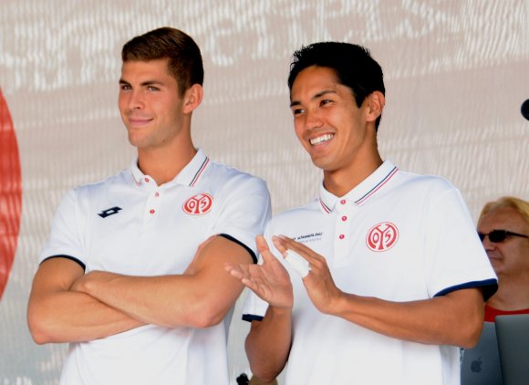 Bundesliga | Peter H. Eisenhuth | 13.08.17 „Das macht mir Muto“ Der FSV Mainz 05 feiert auf dem Domplatz mit rund 5000 Fans. Auch René Adler, der prominenteste Neuzugang der 05er genoss die Atmosphäre auf dem Domplatz. | Eva Willwacher Locker drauf: Cheftrainer Sandro Schwarz. | Eva Willwacher Die Defensiven: Leon Balogun, Gaetan Bussmann, Daniel Brosinski... | Eva Willwacher ...und Kapitän Niko Bungert mit Sportvorstand Rouven Schröder. | Eva Willwacher Blick von der Bühne: Rund 5000 Fans feierten im Schatten des Doms. | Eva Willwacher Abdou Diallo (r.) ging diesen Weg zum ersten Mal... | Eva Willwacher ...und das Funktionsteam hat man noch nie in dieser Zusammensetzung gesehen. | Eva Willwacher Mainz. Ein gewisses Risiko war mit diesem Termin ja verbunden. Hätte der FSV Mainz 05 am Samstag sein DFB-Pokalspiel beim Lüneburger SK Hansa vergeigt, wäre das Domplatzfest des Bundesligisten am Sonntagnachmittag wahrscheinlich nicht in dieser fröhlich-optimistischen Atmosphäre abgelaufen, die fast 5000 Fans sowie die Mannschaft und ihre Verantwortlichen schufen. Gut möglich auch, dass die Profis in diesem Fall nicht mit dem Bus bis zur Bühne gebracht worden wären, sondern sich im Büßergewand zu Fuß ihren Weg hätten bahnen müssen. So aber war der 3:1-Erfolg beim Nord-Regionalligisten, der souveräner ausfiel, als es das Resultat vermittelt, durchaus angetan, die Vorfreude auf den Bundesligaauftakt gegen Hannover 96 am kommenden Samstag noch zu steigern. Entsprechend begeistert wurden Cheftrainer Sandro Schwarz und sein Team, allen voran Torwart René Adler und Publikumsliebling Pablo De Blasis, von den Fans empfangen. „Es ist ein schönes Zeichen für den Verein, dass ihr alle da seid“, rief Sportvorstand Rouven Schröder den Anhängern zu. Und Johannes Kaluza, der Vorsitzende des Klubs, stand noch ganz unter den Eindrücken des Pokalsiegs, zu dem der japanische Stürmer der 05er zwei Treffer beigesteuert hatte: „Das macht mir Muto“, kalauerte er. Den Auftakt des Festes, das bei manchem Amateurfußballvertreter angesichts des Saisonbeginns in allen Klassen von der Landesliga abwärts auf gedämpfte Begeisterung stieß, bildete die Mainzer Spaß-Combo „Se Bummtschacks“ – womit deren Frontmann Sven Hieronymus, Mitglied des neuen 05-Aufsichtsrates geschafft hat, was selbst Ex-Präsident und Freizeit-Rock’n’roller Harald Strutz während seiner fast 29-jährigen Amtszeit nie verbuchte: als Funktionär des Klubs von diesem für einen Gesangsauftritt bezahlt zu werden. „Der Aufsichtsrat hat den Auftritt von Sven Hieronymus genehmigt“, berichtete dessen Vorsitzender Detlev Höhne. Mehr aktuellen Sport aus Mainz lesen Sie hier. Alle Artikel von Fußball (Bundesliga)